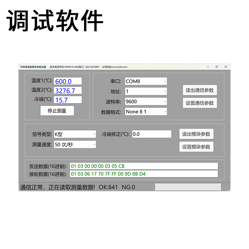 測量熱電偶(K、E、J、N、T、R、B、S)溫度傳感器信號(hào),通過RS485通信或模擬量變送輸出。RS485通信接口,采用標(biāo)準(zhǔn)的modbus-rtu協(xié)議,可與各種組態(tài)軟件,PLC,觸摸屏等聯(lián)網(wǎng)通信,通信地址:1~247;波特率:2400、4800、9600、19200、38000、57600、115200;校驗(yàn)位:無校驗(yàn),奇校驗(yàn),偶校驗(yàn)。模擬量變送輸出,模擬量可選DC4-20mA,DC0-20mA,DC0-5V,DC0-10V等,輸出的模擬量與測量溫度成正比。電源輸入范圍DC9~36V,電源,輸入信號(hào),RS485通信,模擬量變送輸出之間相互電氣隔離,隔離電壓≥2KV。提供參數(shù)設(shè)置上位機(jī)軟件,方便對模塊參數(shù)設(shè)置及通信調(diào)試。