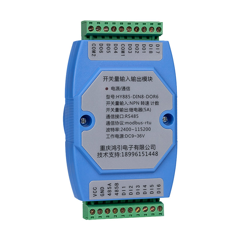8路開關(guān)量輸入,干接點輸入,6路繼電器輸出。8路開關(guān)量輸入,每路都帶計數(shù)功能,計數(shù)值帶掉電保存功能,掉電不丟失;第1、2路輸入可選接編碼器輸入(方向自動識別,加減計數(shù))或普通輸入;每路輸入都帶濾波功能,濾波時間可設(shè)(可有效防止按鍵,繼電器這種有抖動的輸入誤計數(shù)問題)。第1路開關(guān)量輸入,帶轉(zhuǎn)速測量功能。繼電器輸出有電平輸出模式和脈沖輸出模式,脈沖輸出模式的脈沖時間可設(shè)。RS485采用標(biāo)準(zhǔn)modbus-rtu協(xié)議,可與各種組態(tài)軟件、PLC、觸摸屏聯(lián)網(wǎng)。出廠預(yù)設(shè)RS485通信參數(shù):模塊地址1,波特率9600,8個數(shù)據(jù)位,無校驗位,1位停止位,用戶通過上位機(jī)參數(shù)設(shè)置軟件修改通信參數(shù)。