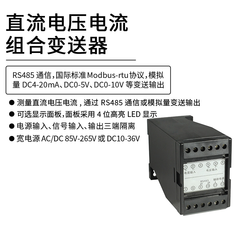 HY194-BS5U(HY194-BS5I)直流電壓(電流)變送器,是一種將直流電壓(電流)信號(hào)隔離轉(zhuǎn)換成線性直流模擬信號(hào)輸出或RS485數(shù)字通信接口輸出。模擬量輸出最多可選2路輸出,2路模擬量輸出之間互相隔離,模擬量可選:DC0~20mA、DC4~20mA、DC0~5V、DC1~5V、DC0~10V等變送輸出。RS-485數(shù)字通訊接口,采用國際標(biāo)準(zhǔn)MODBUS-RTU通訊協(xié)議,可與各種PLC、HMI、組態(tài)軟件實(shí)現(xiàn)組網(wǎng);可選顯示面板,面板采用4位高亮LED 顯示,并帶有3個(gè)按鍵用來進(jìn)行參數(shù)設(shè)置。