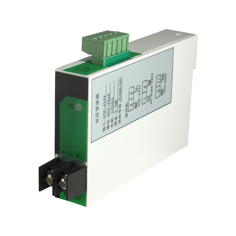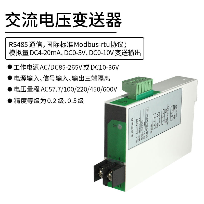 單相交流電壓變送器,是一種將電網(wǎng)中的電壓參數(shù),經(jīng)隔離變送成線性的直流模擬信號的裝置。模擬量可選:DC0~20mA、DC4~20mA、DC0~5V、DC0~10V等變送輸出。高精度測量單相交流電壓,精度達(dá)0.5%。RS485通信接口,采用國際標(biāo)準(zhǔn)Modbus-rtu通訊協(xié)議,可與各種PLC、HMI、組態(tài)軟件實現(xiàn)組網(wǎng)。