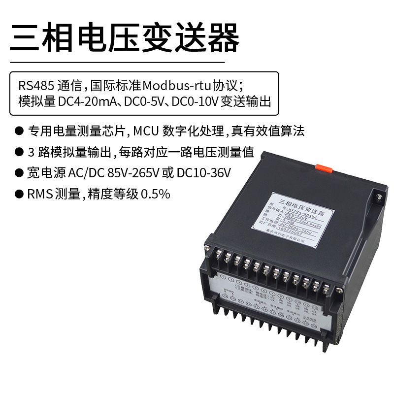 三相電壓變送器,通過專用電量芯片采樣,CPU 數(shù)字化處理,真有效值算法,高精度的測(cè)量三相電壓,隔離轉(zhuǎn)換成線性直流標(biāo)準(zhǔn)模擬信號(hào)輸出或RS485數(shù)字通信接口輸出。模擬量可選:DC0~20mA、DC4~20mA、DC0~5V、DC1~5V、DC0~10V等變送輸出;RS485數(shù)字通信接口,采用國際標(biāo)準(zhǔn)Modbus-rtu通信協(xié)議,可與各種PLC、HMI、組態(tài)軟件實(shí)現(xiàn)組網(wǎng)。
