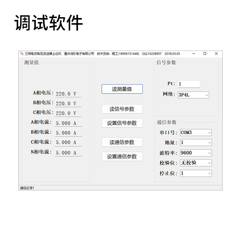 通過上位機(jī)調(diào)試軟件,可以讀出三相電壓測(cè)量值;可以設(shè)置電壓變比,接線方式;可以設(shè)置電壓變送器的通信地址,波特率,數(shù)據(jù)格式等。上位機(jī)調(diào)試軟件界面: