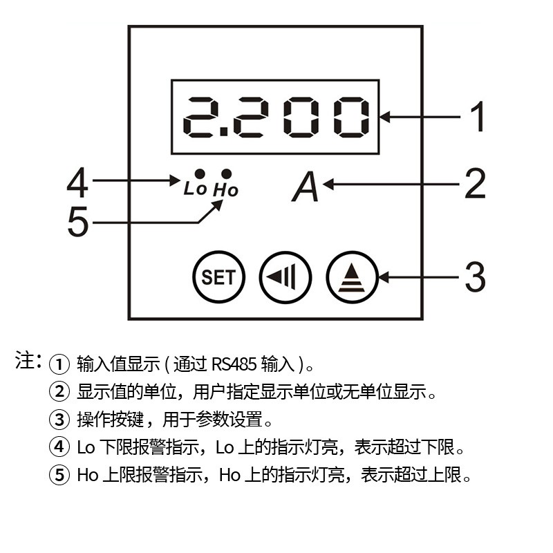 ⑤、Ho上限報(bào)警指示,Ho上的指示燈亮,表示超過上限。