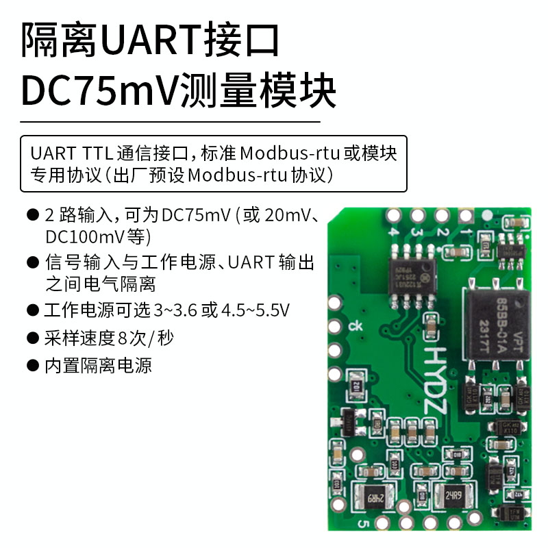 隔離DC20mV、DC75mV、DC100mV等測量模塊,集成高精度ADC、32位ARM單片機、信號調(diào)理電路、數(shù)字隔離電路和隔離電源電路于一體(模塊內(nèi)部集成了隔離電源),易于集成到各種測量設(shè)備中;同時進行2路信號測量,只需接入要測量的DC20mV、DC75mV、DC100mV信號;模塊通過隔離UART TTL接口與外部通信,進行測量數(shù)據(jù)輸出和參數(shù)設(shè)置;通信支持2種通信協(xié)議,1、模塊專用協(xié)議,2、標準modbus rtu協(xié)議。通信波特率:2400、4800、9600、19200、38000、57600、115200用戶可設(shè)。工作電源5V或3.3V(用戶定貨時說明),信號輸入與通信輸出和電源電氣隔離。